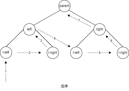 - 优先访问左右子结点,最后访问父结点