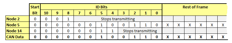 通过这种方式,具有最低 ID 值的节点赢得仲裁并被优先传输帧的其余部分。