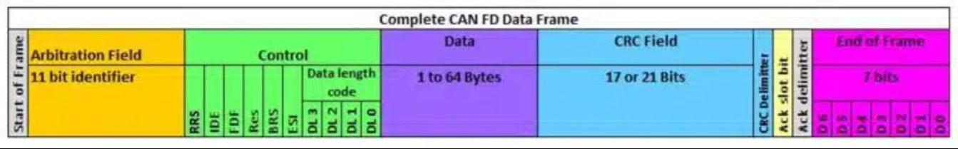 在 CRC 字段之后,Ack 和帧尾结构与经典 CAN 相同。