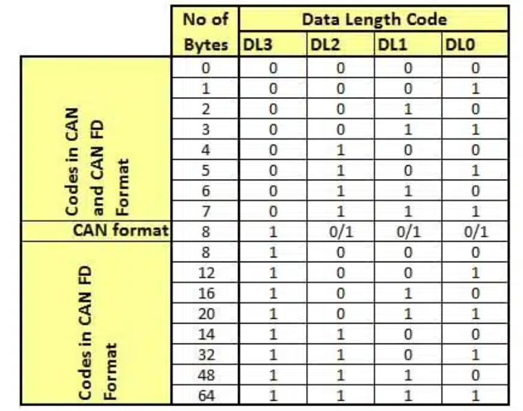 数据字段中的字节数由数据长度码(DLC)指示。在 CAN 和 CAN FD中 编码不同。前九个代码相同,但随后的代码,在 CAN 中都指定数据字段为 8 个字节 DATA FIELD, 在CAN FD 中指定更长的 DATA FIELD。