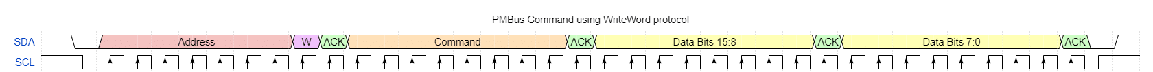 下面显示了一个示例时序图,其中主机控制器向目标设备发出一个命令,后跟两个数据字节。这遵循 SMBus WriteWord 协议。