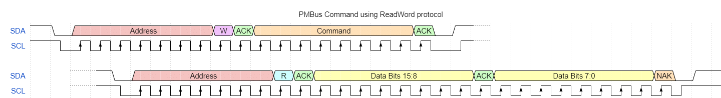 下面显示了一个示例时序图,其中主机控制器发出命令,然后从目标设备接收两个数据字节。这遵循 SMBus ReadWord 协议。